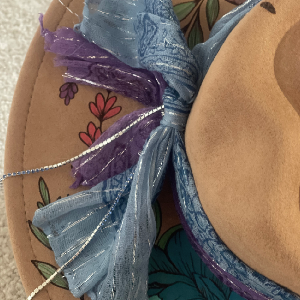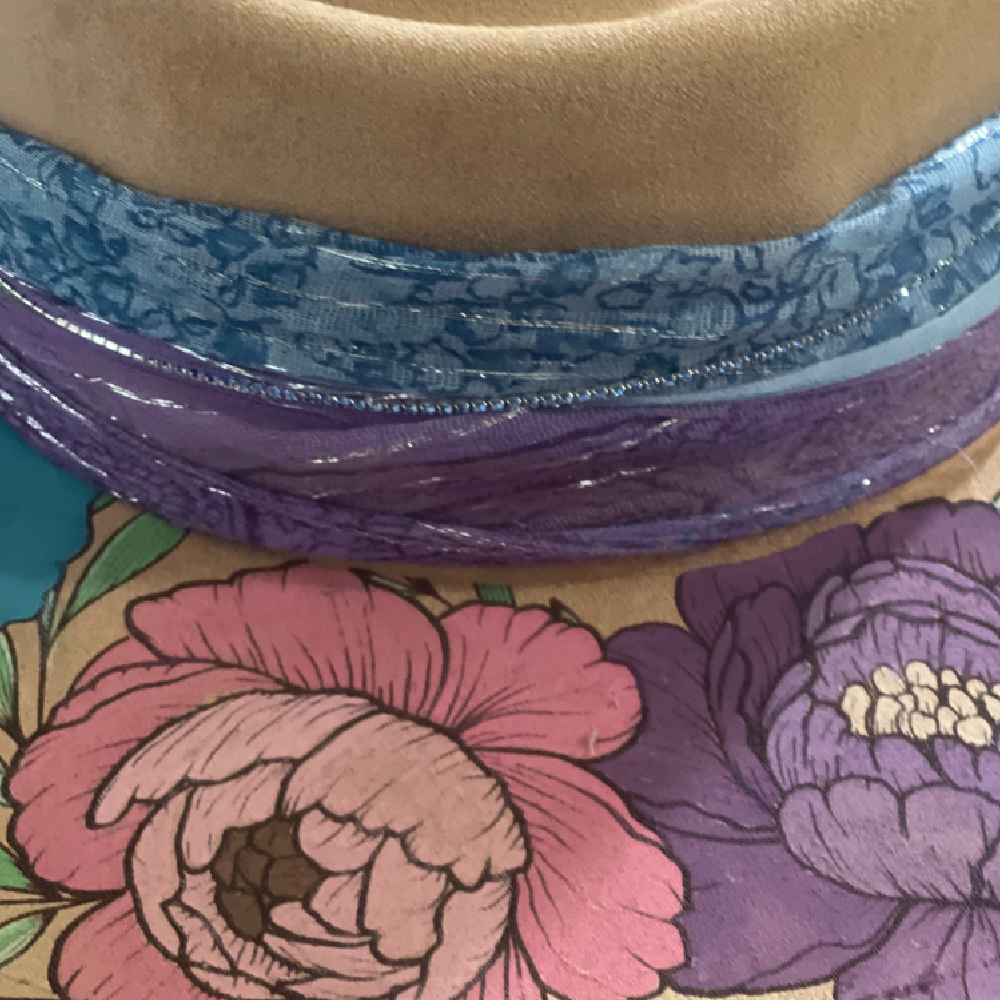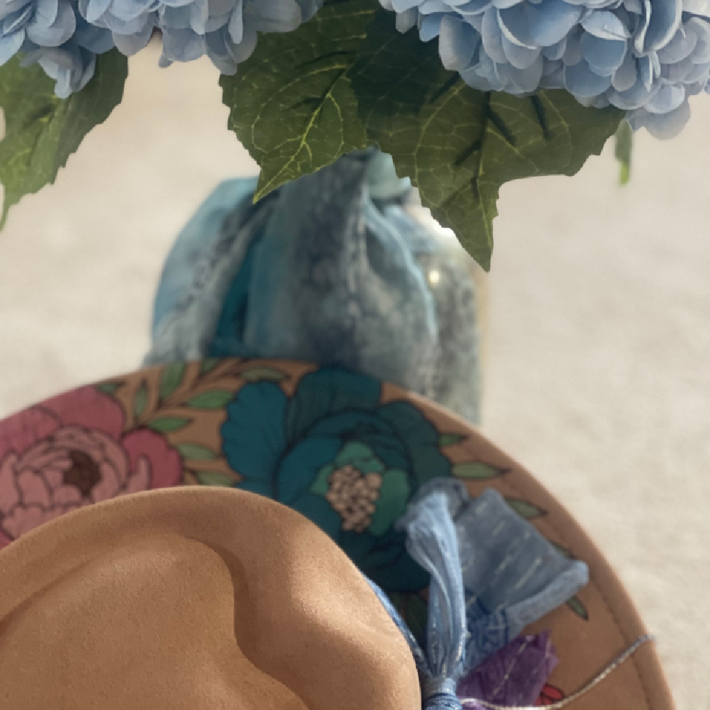 Each petal tells a story of patience and grace. Hand burned and delicately painted peonies brought to life with layers of soft acrylics that capture their natural blush and bloom. The layered hat bands shimmer with rhinestone bling. A perfect harmony of elegance and artistry. Art that dares you to wear it.