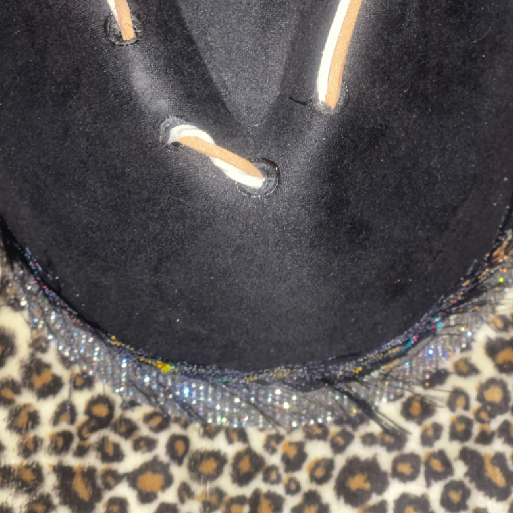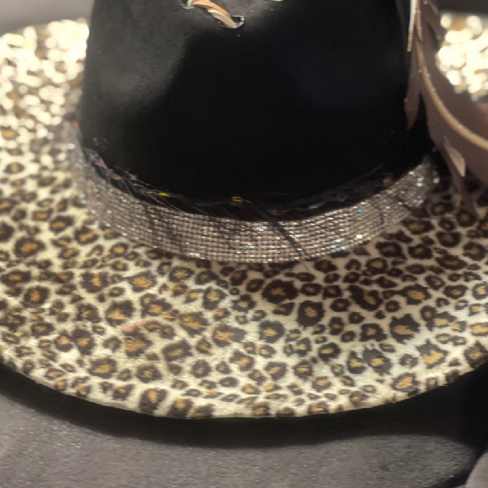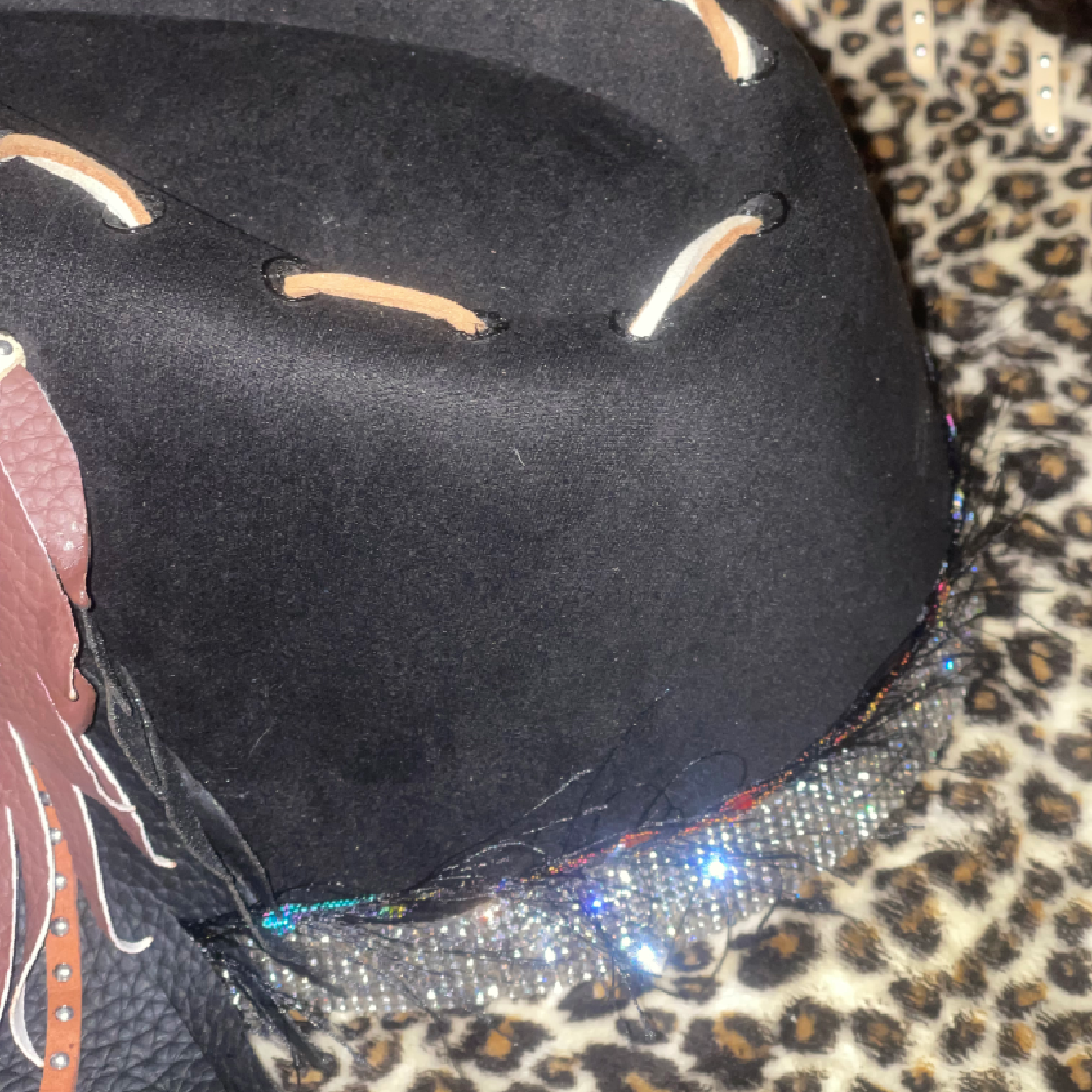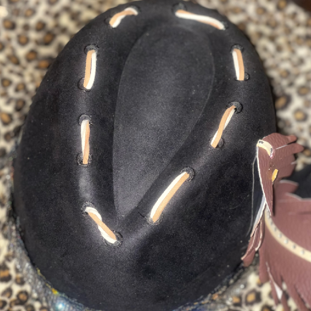 The untamed meets divine. The black crown wrapped in rhinestones and hand cut leather feathers that whisper of wild power. Two tone crown lacing. It screams fierce, fearless and unforgettable.