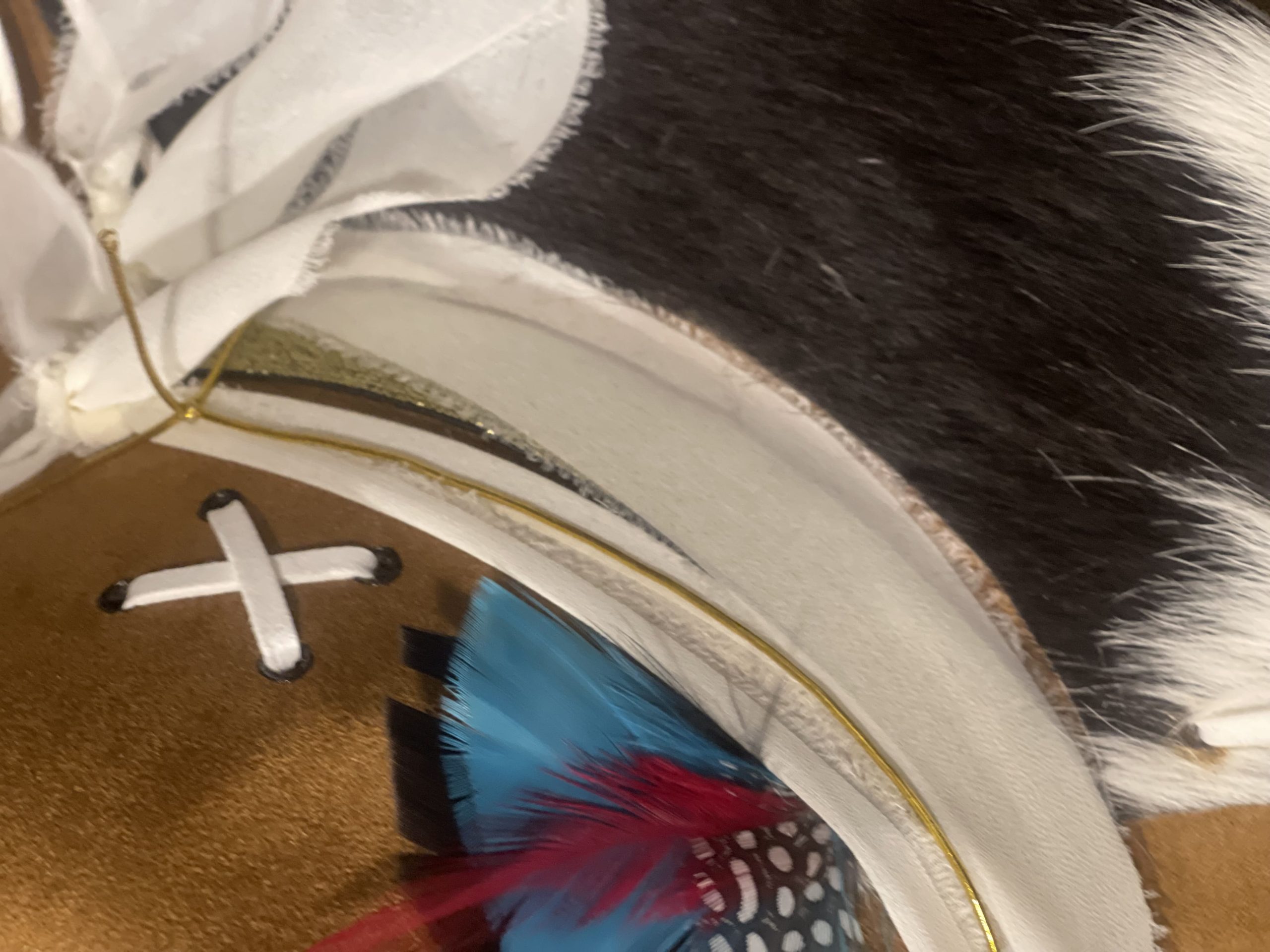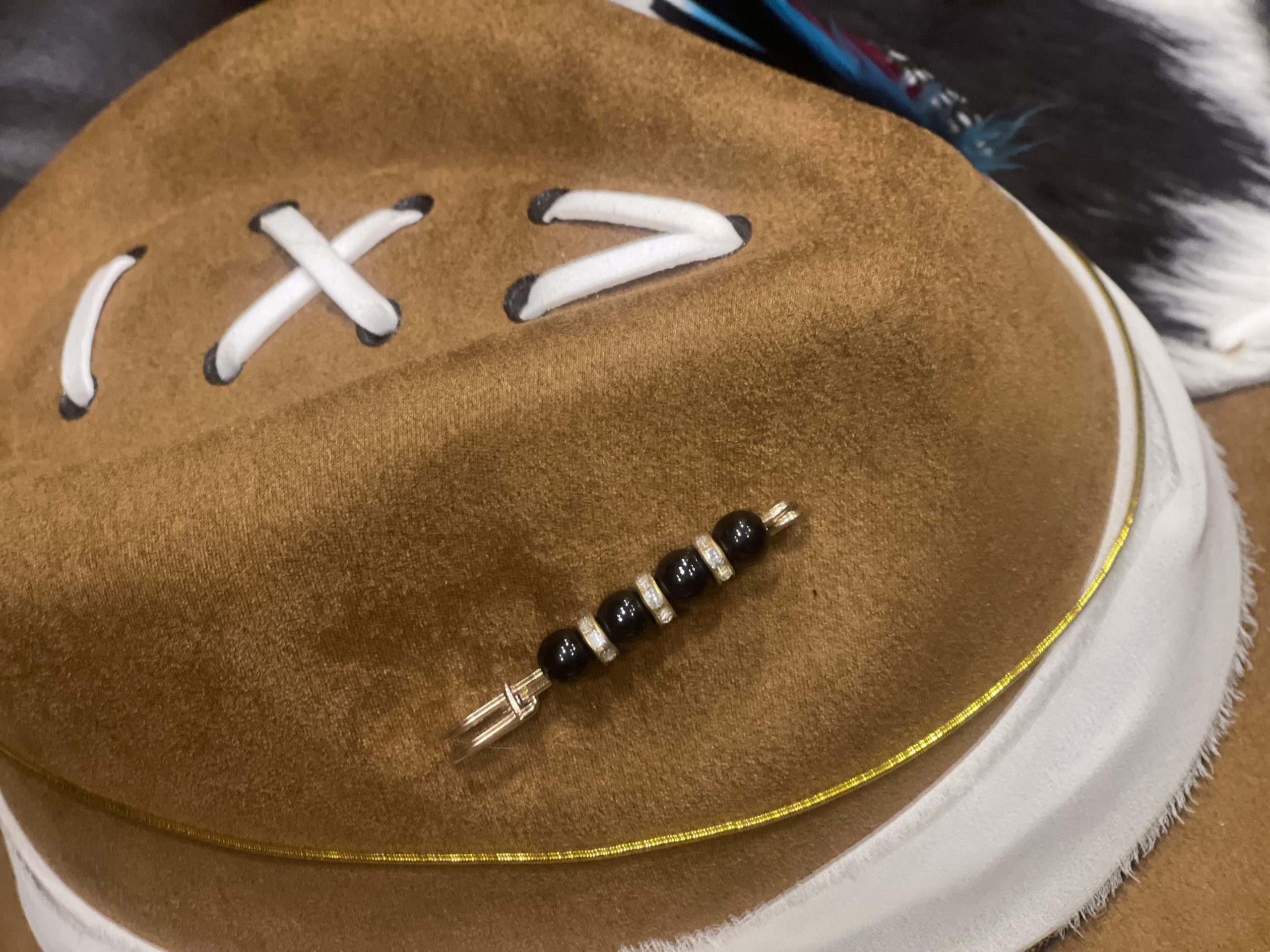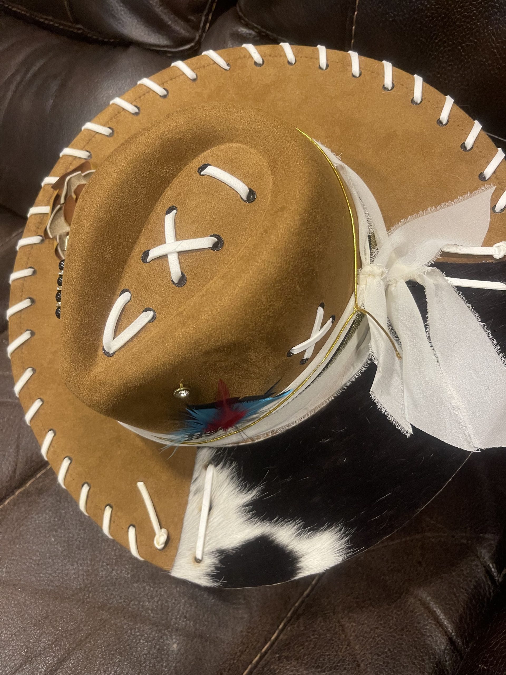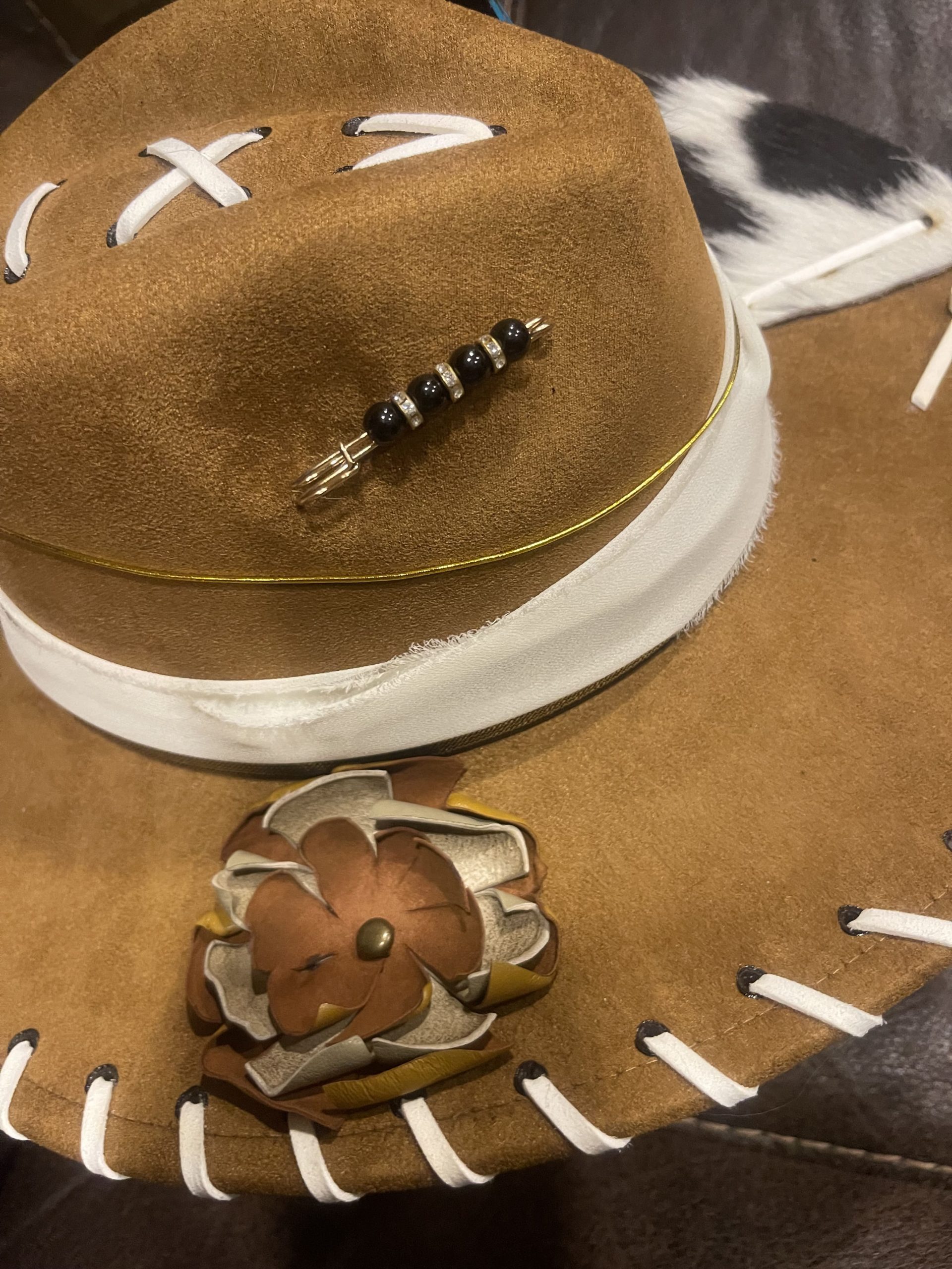 Soft caramel vegan suede rancher with hand lacing and cow hide brim. Soft feminine elegance adorned with feathers and hat pin yet giving that overall Western vibe still being achieved. Whispering Ember defies the ordinary.