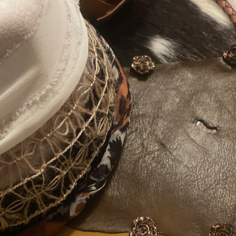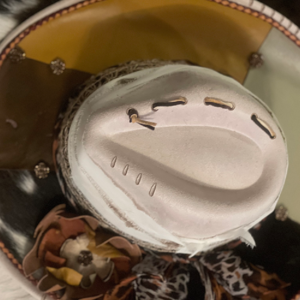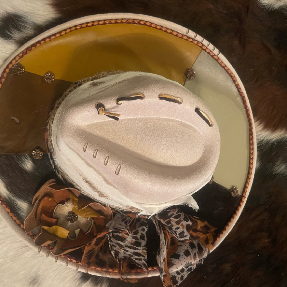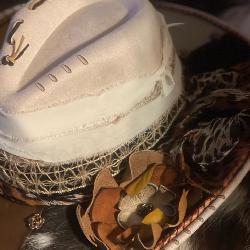 Where softness meets strength. Blends of sheepskin and cowhide leather textures with a braided trim. Perfect neutrals to enhance you. Laced crown and hand cut leather bloom. Chiffon tied hand band drapes with effortless grace. The perfect harmony of art and wilderness.